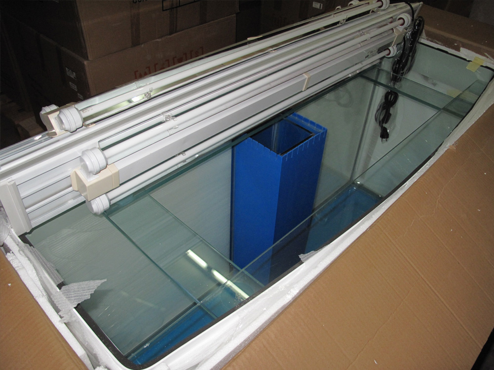 Panorama-Aquarium T5 weiß hochglanz / zentraler Überlaufschacht + Unterschrank-Filterbecken