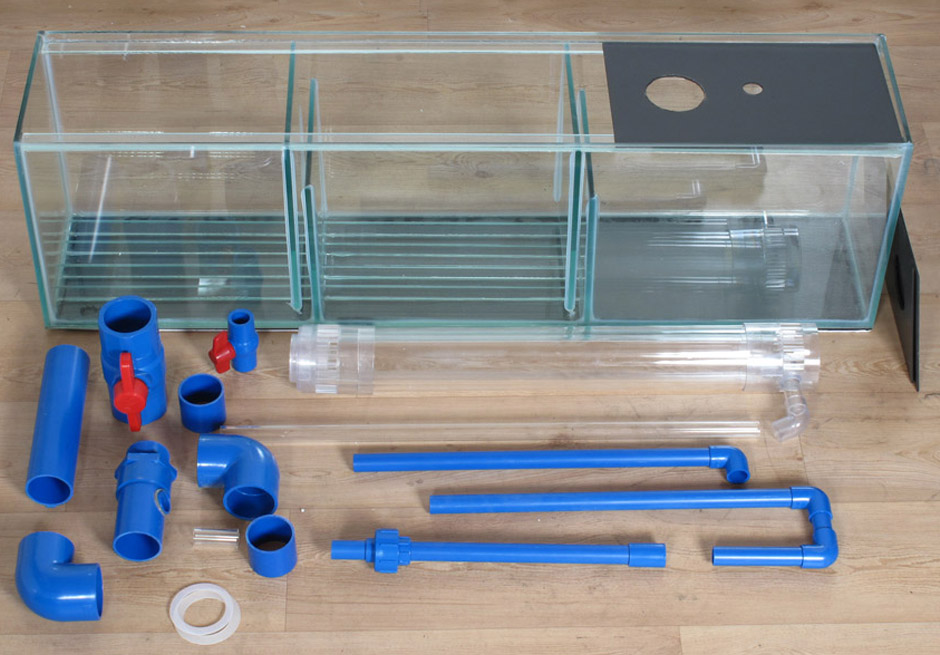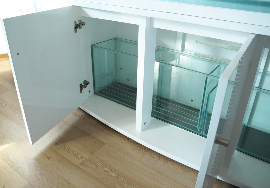 Im Boden des Glaskörpers gibt es eine Bohrung für den Überlauffilter. Im Unterschrank ist ein Mehrkammerfilter.